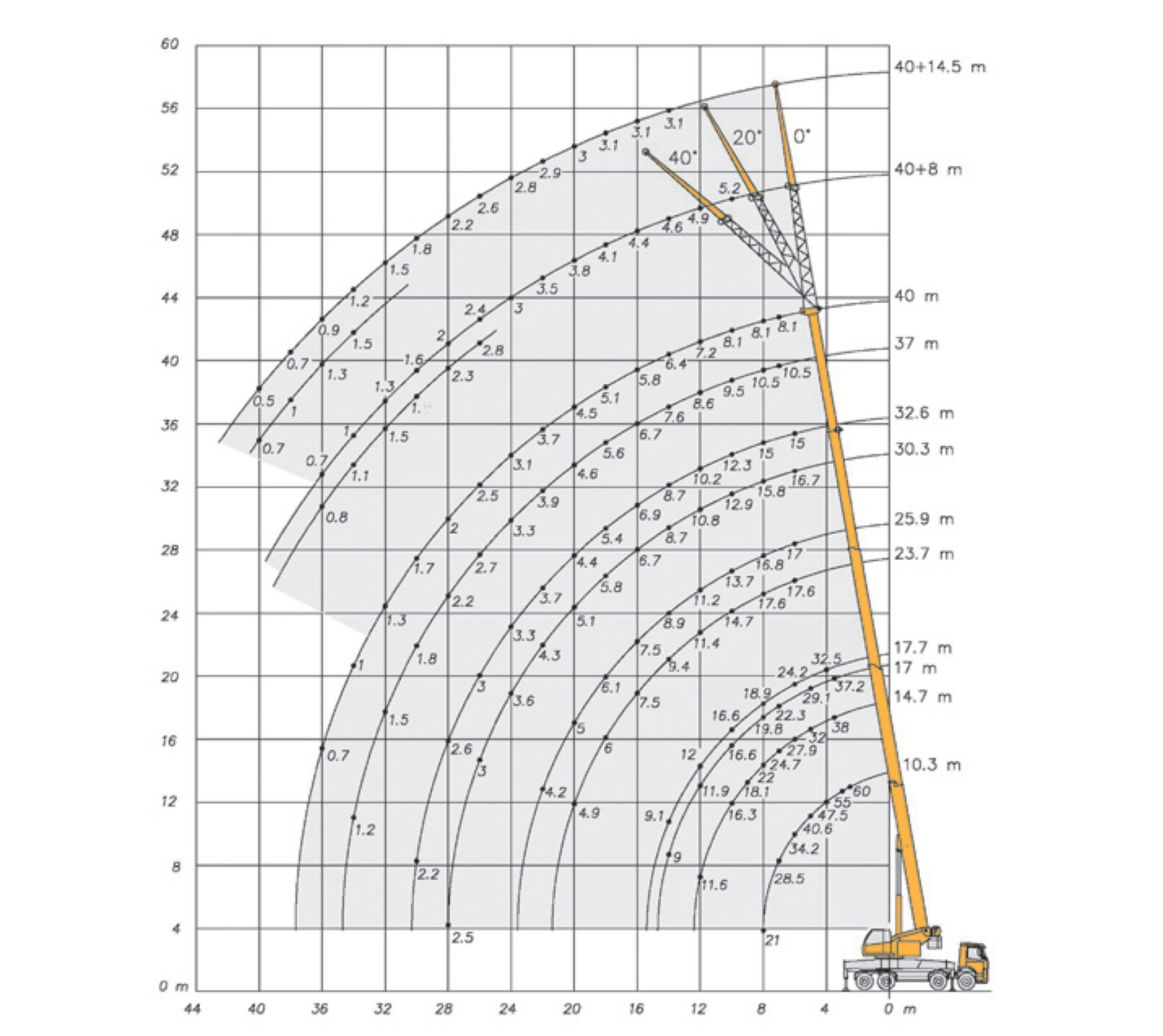 – I carichi indicati per il braccio principale sono intesi con prolunga tralicciata e falcone smontati.