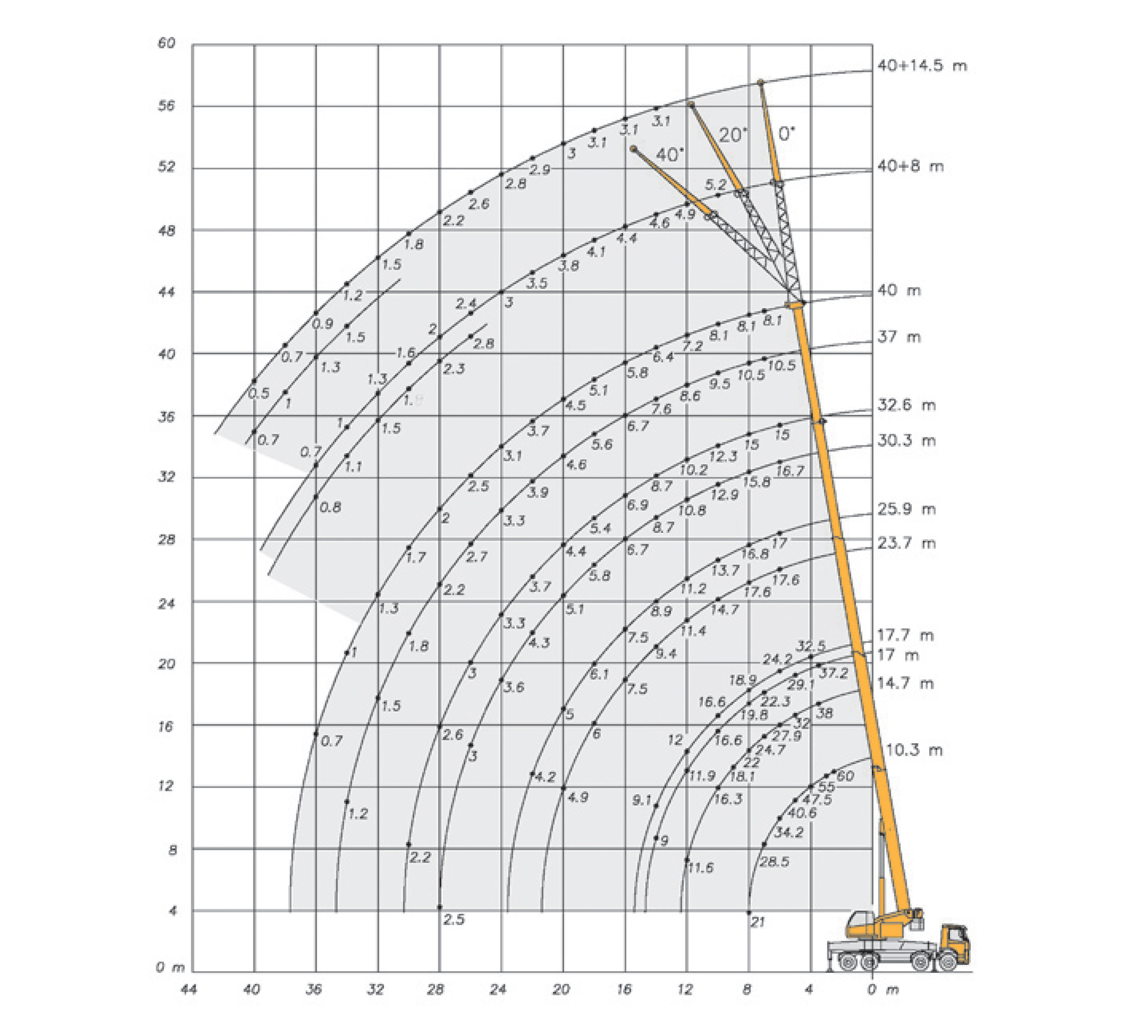 – I carichi indicati per il braccio principale sono intesi con prolunga tralicciata e falcone smontati.